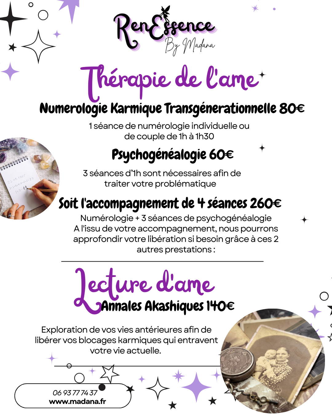 A l’issue de votre séance de numérologie, vous pourrez si vous le souhaitez poursuivre votre accompagnement et libérer vos blocages transgénérationnels grâce aux séances de psychogénéalogie et/ou libérer vos blocages karmiques en bénéficiant d’une séance de lecture d’âme.